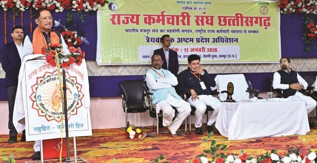 रायपुर,11 जनवरी 2026। कर्मचारी शासन-प्रशासन की रीढ़ होते हैं और उनकी ईमानदारी,कर्मठता तथा संवेदनशीलता से ही सरकार की योजनाएं,नीतियां और निर्णय वास्तविक रूप में धरातल पर उतरते हैं। छत्तीसगढ़ का प्रशासनिक ढांचा आप सभी की मेहनत,निष्ठा और अनुशासन के कारण ही प्रभावी ढंग से कार्य कर पा रहा है। मुख्यमंत्री विष्णु देव साय ने राजधानी रायपुर के रोहिणीपुरम स्थित सरस्वती शिक्षा संस्थान परिसर में राज्य कर्मचारी संघ, छत्तीसगढ़ द्वारा आयोजित त्रैवार्षिक अष्टम प्रदेश अधिवेशन को संबोधित करते हुए यह बात कही। मुख्यमंत्री साय ने प्रदेश के शासकीय अधिकारी-कर्मचारियों के हित में महत्वपूर्ण निर्णय लेते हुए महंगाई भत्ता 55 प्रतिशत से बढ़ाकर केंद्र सरकार के समान 58 प्रतिशत किए जाने की घोषणा की। उन्होंने कहा कि बढ़ती महंगाई के बीच यह निर्णय कर्मचारियों को वास्तविक राहत प्रदान करेगा। उन्होंने कहा कि यह निर्णय सरकार की कर्मचारी-हितैषी प्रतिबद्धता को दर्शाता है। मुख्यमंत्री साय ने अधिवेशन को संबोधित करते हुए कहा कि यह अधिवेशन संगठनात्मक विचार-विमर्श के साथ ही सुशासन के संकल्प को सुदृढ़ करने का एक सशक्त अवसर है। जब सरकार और कर्मचारी कंधे से कंधा मिलाकर कार्य करते हैं, तभी विकास का मार्ग प्रशस्त होता है और शासन व्यवस्था अधिक सशक्त बनती है। उन्होंने कहा कि पिछले दो वर्षों में सरकार ने कर्मचारियों के हित में अनेक महत्वपूर्ण निर्णय लिए हैं। स्थानांतरण नीति, पदोन्नति प्रक्रिया और कार्यस्थल संबंधी व्यवस्थाओं में सुधार कर प्रशासन को अधिक पारदर्शी, सुचारु और कर्मचारी-अनुकूल बनाया गया है। सुशासन एवं अभिसरण विभाग के गठन से जन-विश्वास आधारित शासन तंत्र को और मजबूती मिली है। मुख्यमंत्री साय ने कहा कि पेंशन,ग्रेच्युटी एवं अन्य सेवानिवृत्ति लाभों के समयबद्ध भुगतान पर विशेष ध्यान दिया गया है,ताकि कर्मचारियों को सेवानिवृत्ति के समय किसी भी प्रकार की असुविधा न हो।