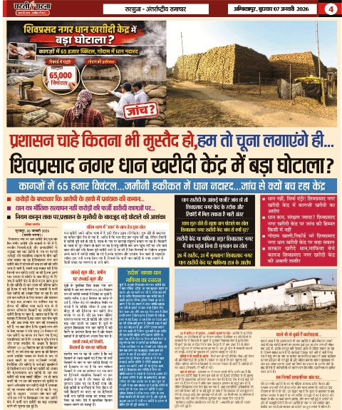 जिला सूरजपुर के शिवप्रसादनगर धान खरीदी केंद्र में लंबे समय से चल रहे कथित धान घोटाले को लेकर दैनिक घटती घटना द्वारा लगातार प्रकाशित खबरों के बाद आखिरकार प्रशासनिक अमला जांच के लिए मौके पर पहुंचा,यह जांच शनिवार को दोपहर 12 बजे से शाम 8 बजे तक करीब 6 घंटे चली, लेकिन इतने लंबे समय के बाद भी न तो धान की सटीक गिनती हो सकी और न ही संदेह के घेरे में आए आंकड़ों पर पूरी तरह से स्थिति स्पष्ट हो पाई। बता दे की शिवप्रसाद नगर धान खरीदी केंद्र में सामने आए बहुचर्चित धान घोटाले की जांच के बाद अब एक नया और गंभीर सवाल खड़ा हो गया है कार्रवाई की जानकारी को सार्वजनिक करने से प्रशासन क्यों बचता नजर आ रहा है? जांच दल द्वारा मौके पर पहुंचकर घंटों मशक्कत करने, भारी मात्रा में धान की कमी पाए जाने और मामला उजागर होने के बावजूद प्रशासनिक तंत्र की चुप्पी और देरी ने पूरे प्रकरण को और अधिक संदिग्ध बना दिया है, दैनिक घटती घटना द्वारा 07 और 10 जनवरी 2026 को प्रकाशित खबरों ने जिस बड़े घोटाले की ओर इशारा किया था, प्रशासनिक जांच ने उसकी पुष्टि तो कर दी है, लेकिन पूरी सच्चाई अब भी परदे में है, सबसे बड़ा सवाल यही है क्या 13,000 बोरी की कमी ही अंतिम सच है,या सच इससे कहीं ज्यादा बड़ा और डरावना है? अब निगाहें इस पर टिकी हैं कि प्रशासन आगे निष्पक्ष और कठोर कार्रवाई करता है या यह मामला भी फाइलों और आंकड़ों के बीच दबकर रह जाएगा।