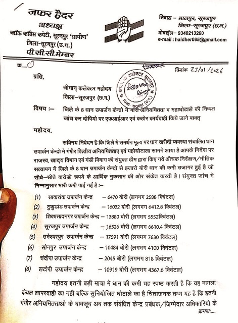 ज्ञापन में यह भी उल्लेख किया गया है कि रामानुजनगर विकासखंड के छिंदिया उपार्जन केंद्र में लगभग 3000 बोरी धान कम पाया गया है,जिसका उल्लेख जांच रजिस्टर में भी दर्ज है,इसके बावजूद इस केंद्र को लेकर अब तक कोई स्पष्ट कार्रवाई सामने नहीं आई है।