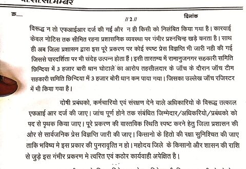 ज्ञापन में यह भी उल्लेख किया गया है कि रामानुजनगर विकासखंड के छिंदिया उपार्जन केंद्र में लगभग 3000 बोरी धान कम पाया गया है,जिसका उल्लेख जांच रजिस्टर में भी दर्ज है,इसके बावजूद इस केंद्र को लेकर अब तक कोई स्पष्ट कार्रवाई सामने नहीं आई है।