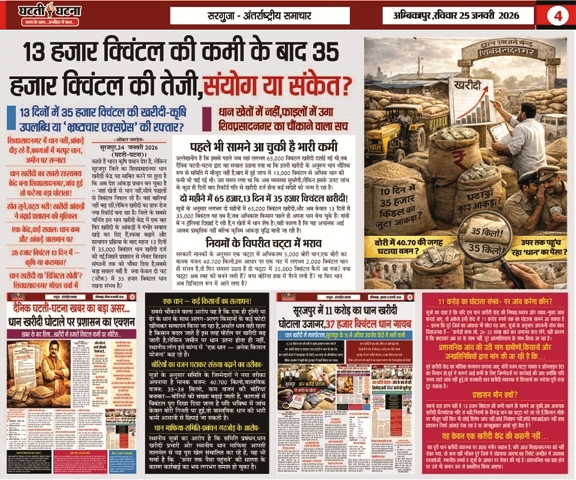 सूरजपुर,27 जनवरी 2026 (घटती-घटना)। सूरजपुर जिले का शिवप्रसादनगर धान खरीदी केंद्र एक बार फिर ऐसे गंभीर आरोपों के घेरे में आ गया है, जिसने न केवल धान खरीदी व्यवस्था बल्कि पूरे प्रशासनिक तंत्र की निष्पक्षता पर बड़ा प्रश्नचिह्न खड़ा कर दिया है,यह वही धान खरीदी केंद्र है जो हर वर्ष किसी न किसी विवाद को लेकर चर्चाओं में बना रहता है,कभी धान की कमी,कभी रिकॉर्ड में हेराफेरी,कभी माफिया की दखलअंदाजी और कभी जांच रिपोर्टों के विरोधाभास—यह केंद्र वर्षों से संदेह के घेरे में रहा है,इस वर्ष मामला इसलिए और गंभीर हो गया क्योंकि एक ही धान खरीदी केंद्र की दो जांचों में दो बिल्कुल विपरीत नतीजे सामने आए। जांच निष्पक्ष हुई — घोटाला सामने आएगा, यदि जांच प्रभावित हुई — धान हमेशा पूरा ही मिलेगा, अब देखना यह है कि शिवप्रसादनगर धान खरीदी केंद्र का सच बाहर आएगा या फिर यह घोटाला भी फाइलों और नोटों के बोरे में दबा दिया जाएगा।