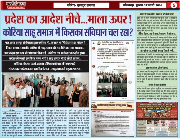 प्रदेश आदेश या स्थानीय महत्वाकांक्षा?- 31 जनवरी 2026 को छत्तीसगढ़ प्रदेश साहू संघ के अध्यक्ष डॉ. नरेंद्र साहू द्वारा जारी पत्र में साफ कहा गया था कि चुनाव प्रक्रिया निरस्त होगी और नई व्यवस्था लागू की जाएगी, लेकिन कोरिया में मानो यह पत्र किसी फाइल का कागज भर रह गया, प्रदेश की लाइन एक तरफज् और स्थानीय घोषणा दूसरी तरफ, अब समाज में यही चर्चा है — क्या कोरिया जिला संगठन प्रदेश से ऊपर हो गया है या फिर कुछ लोग खुद को नियमों से भी बड़ा समझने लगे हैं?