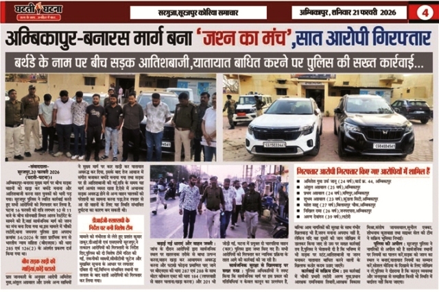 सूरजपुर,26 फरवरी 2026 (घटती-घटना)। राष्ट्रीय राजमार्ग अंबिकापुर-बनारस मार्ग पर बीच सड़क जन्मदिन मनाना और आतिशबाजी करना कुछ युवकों को भारी पड़ गया,इस मामले में चौकी लटोरी पुलिस ने कार्रवाई को आगे बढ़ाते हुए दो और फरार आरोपियों को गिरफ्तार कर लिया है,अब तक इस प्रकरण में कुल 9 आरोपी पुलिस गिरफ्त में आ चुके हैं। यह पूरा घटनाक्रम 16 फरवरी 2026 की रात का है, जब सोनवाही स्थित आरव रेस्टोरेंट के सामने कुछ युवकों ने एनएच पर ही अपने वाहन खड़े कर जन्मदिन का जश्न मनाना शुरू कर दिया। केक काटने के साथ-साथ आतिशबाजी भी की गई,जिससे राष्ट्रीय राजमार्ग पर यातायात बाधित हो गया और राहगीरों को काफी परेशानी का सामना करना पड़ा।