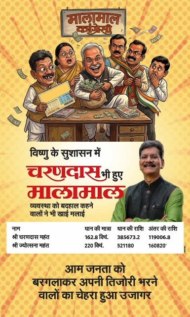 छत्तीसगढ़ में 28 फरवरी को धान की अंतर राशि किसानों के खातों में पहुंचते ही सियासत गरमा गई, भाजपा समर्थित सोशल मीडिया पोस्टों और बैनरों में यह प्रचार किया गया कि कांग्रेस के बड़े नेता भी भाजपा सरकार में मालामाल हो गए, जवाब में कांग्रेस ने इसे किसानों की मेहनत के पैसे पर राजनीति बताया, मामला अब सिर्फ भुगतान का नहीं, बल्कि श्रेय लेने की होड़ और मालामाल शब्द की राजनीतिक व्याख्या का बन गया है।