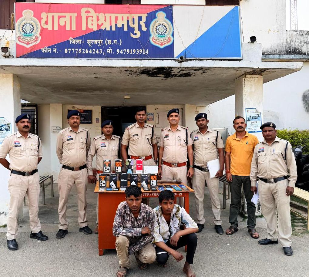 मोबाइल दुकान सेंधमारी मामले का भी खुलासा-इसी तरह एक अन्य मामले में श्रीराम मोबाइल शॉप विश्रामपुर में सेंधमारी कर मोबाइल चोरी करने वाले दो आरोपियों को भी पुलिस ने गिरफ्तार किया है, दुकान संचालक अमित सिंह ने 1 मार्च 2026 को रिपोर्ट दर्ज कराई थी कि 27 फरवरी की रात दुकान बंद करने के बाद अगले दिन सुबह दुकान खोलने पर देखा कि पीछे की दीवार में सेंध लगाकर 17 नए मोबाइल और रिपेयरिंग के लिए आए 10 पुराने मोबाइल चोरी कर लिए गए हैं, पुलिस ने मामला दर्ज कर जांच शुरू की।