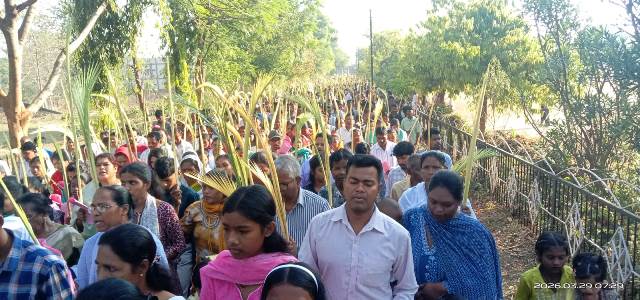 अम्बिकापुर,29 मार्च 2026 (घटती-घटना)। चालीस दिवसीय उपवास के अंतिम चरण ‘पुण्य सप्ताह’ की शुरुआत पर रविवार को नवापारा स्थित बेदाग ईश माता महागिरिजाघर में रोमन कैथोलिक मसीहियों ने श्रद्धा और आस्था के साथ खजूर रविवार (पाम संडे) मनाया। इस अवसर पर शोभायात्रा भी निकाली गई। सुबह 6 बजे धर्मप्रांत सरगुजा के धर्माध्यक्ष बिशप डॉ. अंतोनिस बड़ा के नेतृत्व में खजूर की डालियों की आशीष प्रार्थना सम्पन्न हुई। इसके बाद श्रद्धालु खजूर की डालियां हाथ में लेकर महागिरिजाघर प्रांगण से सेंट जेवियर स्कूल व बीएड कॉलेज परिसर होते हुए पुनः गिरिजाघर पहुंचे। गिरिजाघर में प्रार्थना सभा एवं समारोही मिस्सा बलिदान का आयोजन किया गया। इस दौरान बिशप अंतोनिस बड़ा के साथ पल्ली पुरोहित फादर विलियम उर्रे व फादर जॉर्ज ग्रे कुजूर ने संयुक्त रूप से धार्मिक अनुष्ठान सम्पन्न कराया।