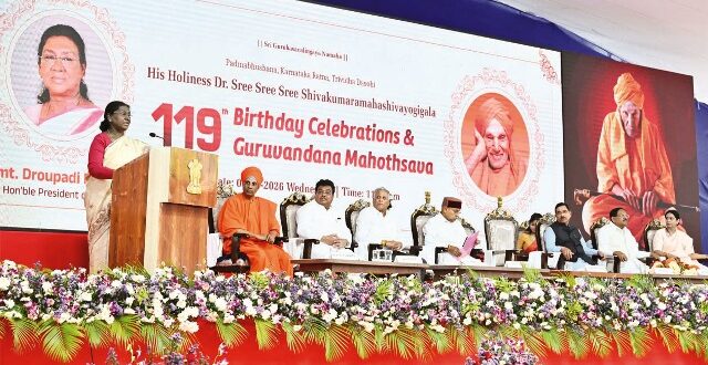 तुमकुरु,01 अप्रैल 2026। राष्ट्रपति द्रौपदी मुर्मू ने कहा कि सिद्धगंगा मठ ने देश के समग्र विकास में महत्वपूर्ण योगदान दिया है और गरीब एवं अनाथ बच्चों को शिक्षा व आश्रय देकर मानवीय मूल्यों को मजबूत किया है। राष्ट्रपति द्रौपदी मुर्मू बुधवार को कर्नाटक के तुमकुरु स्थित सिद्धगंगा मठ के वस्तु प्रदर्शनी मैदान में आयोजित श्री श्री शिवकुमार स्वामीजी की 119वीं जयंती समारोह को सम्बोधित कर रही थींद्य उन्होंने कहा कि मठ की सेवा परंपरा पूरे देश के लिए आदर्श है।