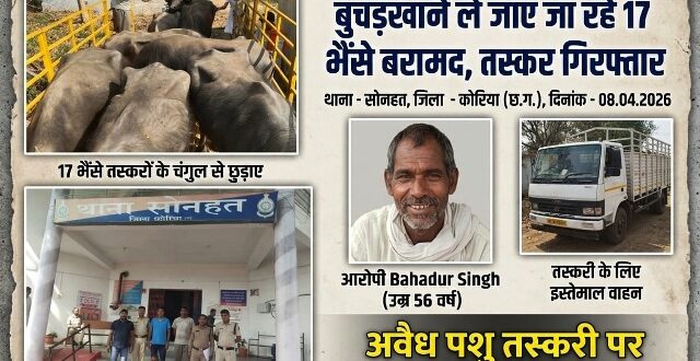 बता दे की पुलिस अधीक्षक रवि कुमार कुर्रे के कड़े निर्देशों पर जिले में अवैध गतिविधियों के खिलाफ अभियान चलाया जा रहा है, इसी कड़ी में 7 अप्रैल को पुलिस को गुप्त सूचना मिली कि ग्राम उज्ञांव (चौकी रामगढ़) में बड़ी संख्या में मवेशियों को छिपाकर रखा गया है, अतिरिक्त पुलिस अधीक्षक सुरेशा चौबे एवं राजेश साहू के मार्गदर्शन में थाना प्रभारी विनोद पासवान के नेतृत्व में पुलिस टीम ने तत्काल मौके पर दबिश दी,वहां आरोपी बहादुर सिंह (56 वर्ष) के कब्जे से 17 भैंसे बरामद हुए, इन बेजुबानों को बेहद अमानवीय तरीके से रस्सियों से बांधकर रखा गया था जिस पुलिस ने आरोपियों के खिलाफ सख्त रुख अपनाते हुए विभिन्न धाराओं के तहत मामला दर्ज किया है,छत्तीसगढ़ कृषि पशु परीक्षण अधिनियम 2004 धारा 4, 6, 10, पशु क्रूरता निवारण अधिनियम 1960 धारा 11(1)(घ) के तहत कानूनी कार्यवाही की।