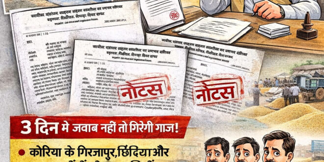 कोरिया जिले में खरीफ विपणन वर्ष 2025-26 के अंतर्गत धान खरीदी कार्य में अनियमितता और लापरवाही का मामला सामने आया है, सहायक आयुक्त सहकारिता एवं सहायक पंजीयक, बैकुंठपुर द्वारा 8 अप्रैल 2026 को जारी आदेश के तहत गिरजापुर, छिंदिया और सलका धान खरीदी केंद्रों के प्रभारियों को कारण बताओ नोटिस जारी किया गया है, दस्तावेज़ के अनुसार संबंधित प्रभारियों को शासन के निर्देशानुसार धान खरीदी, उसके सुरक्षित भंडारण, समय पर उठाव और निराकरण की जिम्मेदारी सौंपी गई थी, इसके बावजूद इन केंद्रों में धान का उठाव एवं निराकरण कार्य लंबित पाया गया, जो प्रशासनिक निर्देशों की अवहेलना मानी गई है, नोटिस के अनुसार गिरजापुर केंद्र के प्रभारी राम कुमार साहू को नोटिस जारी कर पूछा गया है कि अब तक धान का उठाव और निराकरण क्यों नहीं किया गया, दूसरा नोटिस छिंदिया केंद्र के प्रभारी रवि कुमार साहू तथा तीसरा नोटिस सलका केंद्र के प्रभारी श्रीराम यादव को भी समान कारण बताओ नोटिस जारी किया गया है, तीन केंद्र प्रभारियों को नोटिस जारी होने के बाद जिले के अन्य धान खरीदी केंद्रों में भी हलचल तेज हो गई है, अब यह देखना अहम होगा कि संबंधित अधिकारी समय पर जवाब देते हैं या फिर उनके खिलाफ सख्त कार्रवाई होती है, प्रशासन की इस पहल से व्यवस्था में सुधार की उम्मीद जताई जा रही है।