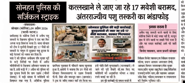 सोनहत थाना पुलिस ने अवैध पशु तस्करी के खिलाफ कार्रवाई करते हुए एक खेप पकड़ी, जो कथित तौर पर अन्य राज्य में सप्लाई की जा रही थी, इस मामले में झारखंड के एक मकसूद खान के साथ भाजपा नेता पी.पी. सिंह का नाम एफ आई आर में आया है, आरोपी फिलहाल फरार बताए जा रहे है, वही पुलिस अभी आरोपियों के खोज बीन में डटी है।