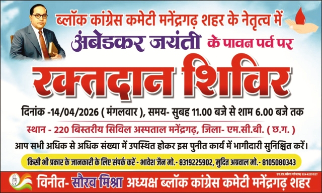 मनेंद्रगढ़,12 अप्रैल 2026 (घटती-घटना)। भारत रत्न डॉ. भीमराव अंबेडकर की जयंती के पावन अवसर पर मनेंद्रगढ़ में एक भव्य रक्तदान शिविर का आयोजन किया जा रहा है, यह शिविर 14 अप्रैल को ब्लॉक कांग्रेस कमेटी मनेंद्रगढ़ शहर के नेतृत्व में 220 बिस्तरीय सिविल अस्पताल परिसर में आयोजित होगा, आयोजन सुबह 11ः00 बजे से शाम 6ः00 बजे तक चलेगा, जिसमें बड़ी संख्या में नागरिकों की भागीदारी की अपेक्षा जताई गई है।