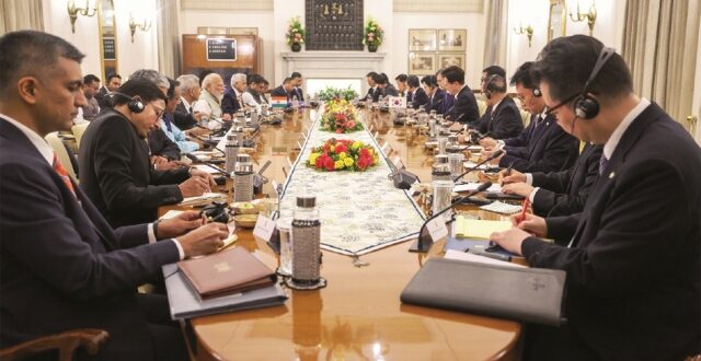 भारत और दक्षिण कोरिया ने अपने व्यापक आर्थिक साझेदारी समझौते (सीईपीए) को अपग्रेड करने के लिए बातचीत शुरू करने पर सहमति जताई। यह निर्णय वैश्विक स्तर पर बढ़ते भू-राजनीतिक तनाव और व्यापारिक व्यवधानों के बीच दोनों देशों के आर्थिक सहयोग को नई दिशा देने के उद्देश्य से लिया गया है। प्रधानमंत्री नरेन्द्र मोदी और दक्षिण कोरिया के राष्ट्रपति ली जे-म्युंग के बीच सोमवार को हैदराबाद हाउस में हुई द्विपक्षीय वार्ता के बाद यह घोषणा की गई। इस दौरान दोनों देशों के बीच कई समझौता ज्ञापनों (एमओयू) और अन्य महत्वपूर्ण समझौतों का आदान-प्रदान भी हुआ। हैदराबाद हाउस में संयुक्त संवाददाता सम्मेलन के दौरान प्रधानमंत्री मोदी ने कहा, ‘चिप्स से लेकर शिप्स, टैलेंट से लेकर टेक्नोलॉजी,एंटरटेनमेंट से लेकर एनर्जी—भारत और कोरिया मिलकर सहयोग के नए अवसरों को साकार करेंगे।’ उन्होंने इस यात्रा को द्विपक्षीय संबंधों के लिए ‘महत्वपूर्ण मोड़’ बताते हुए कहा कि दोनों देश अपनी साझेदारी को एक ‘भविष्य उन्मुख’ दिशा में ले जा रहे हैं। प्रधानमंत्री ने बताया कि भारत और दक्षिण कोरिया के बीच द्विपक्षीय व्यापार वर्तमान में लगभग 27 अरब डॉलर तक पहुंच चुका है, जिसे वर्ष 2030 तक बढ़ाकर 50 अरब डॉलर करने का लक्ष्य रखा गया है। इस लक्ष्य को हासिल करने के लिए दोनों देशों ने कई अहम कदम उठाने पर सहमति व्यक्त की है, जिनमें ‘भारत-कोरिया वित्तीय मंच’ की स्थापना भी शामिल है। डिजिटल और प्रौद्योगिकी क्षेत्र में सहयोग को मजबूत करने के लिए ‘इंडिया-कोरिया डिजिटल ब्रिज’ पहल शुरू करने की घोषणा की गई है।