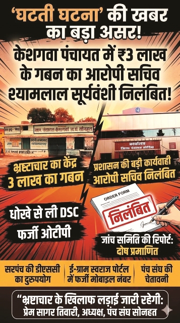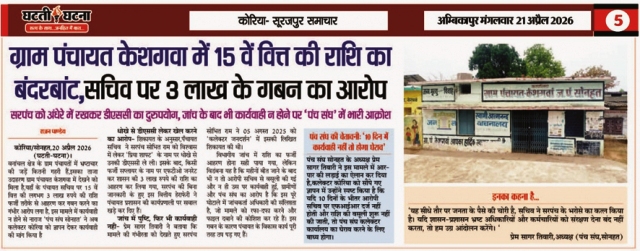 सोनहत/कोरिया,23 अप्रैल 2026 (घटती-घटना)। वनांचल क्षेत्र की ग्राम पंचायतों में भ्रष्टाचार के खिलाफ ‘घटती-घटना’ द्वारा प्रमुखता से उठाई गई आवाज का बड़ा असर देखने को मिला है,ग्राम पंचायत केशगवा में 15 वें वित्त की राशि के बंदरबांट और सरपंच को धोखे में रखकर 3 लाख रुपये के गबन मामले में जिला प्रशासन ने कड़ा रुख अपनाते हुए आरोपी सचिव श्यामलाल सूर्यवंशी को तत्काल प्रभाव से निलंबित कर दिया है।
