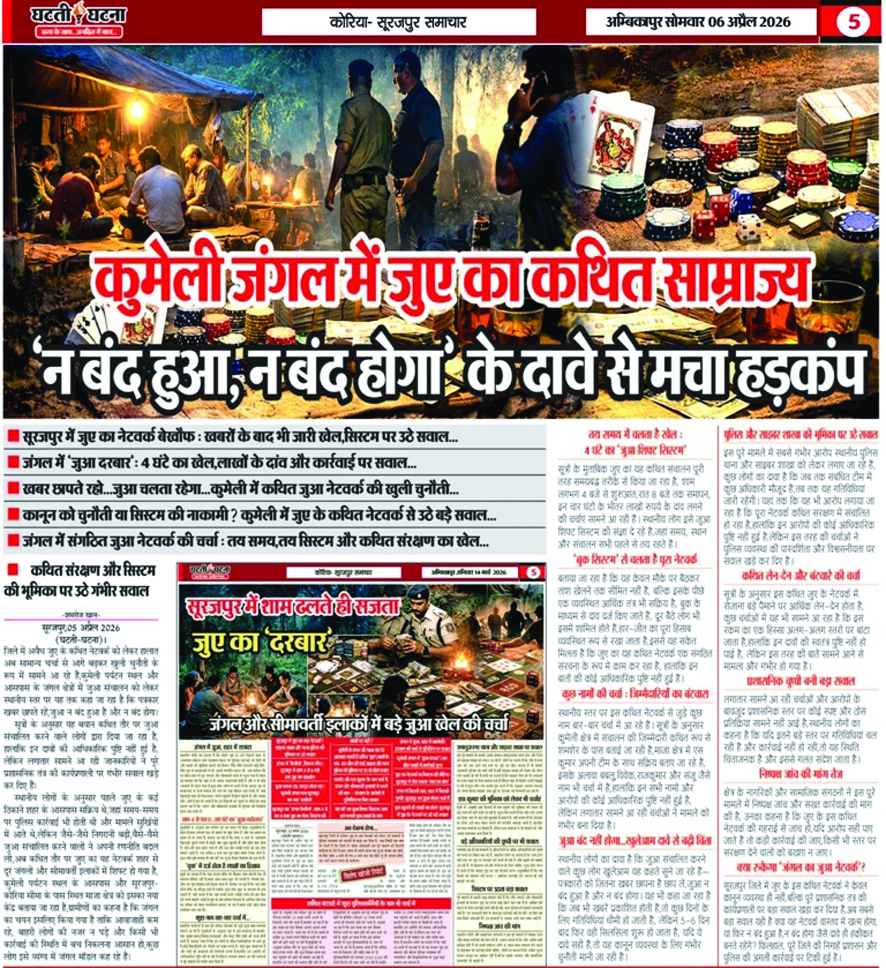 इस पूरे मामले की शुरुआत उस समय हुई जब सूरजपुर जिले के कुमेली जंगल क्षेत्र में बड़े पैमाने पर जुआ संचालित होने की खबरें सामने आईं, प्रारंभिक रिपोर्टों में यह संकेत दिया गया कि यह कोई सामान्य स्तर का जुआ नहीं था, बल्कि संगठित तरीके से संचालित एक नेटवर्क था, जिसमें लाखों रुपये का लेन-देन हो रहा था। जंगल के भीतर देर रात तक चलने वाले इस खेल ने स्थानीय स्तर पर कई सवाल खड़े किए, समाचारों में यह भी बताया गया कि यह गतिविधि अचानक नहीं शुरू हुई थी, बल्कि लंबे समय से चल रही थी, इससे यह संदेह और गहरा हुआ कि कहीं न कहीं इसे संरक्षण मिल रहा है, क्योंकि इतने बड़े स्तर पर बिना किसी जानकारी के जुआ संचालित होना संभव नहीं माना जा सकता।