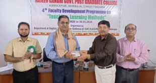 -संवाददाता-अम्बिकापुर,31 मार्च 2026 (घटती-घटना)। राजीव गांधी शासकीय स्नातकोत्तर महाविद्यालय में 23 से 30 मार्च तक ‘टीचिंग लर्निंग मेथड’ विषय पर सात दिवसीय फैकल्टी डेवलपमेंट प्रोग्राम का आयोजन किया गया। कार्यक्रम का उद्देश्य शिक्षकों को आधुनिक शिक्षण पद्धतियों से परिचित कराना और राष्ट्रीय शिक्षा नीति 2020 के अनुरूप शिक्षण को अधिक प्रभावी बनाना रहा। कार्यक्रम के संयोजक प्रो. राजकमल मिश्र ने …